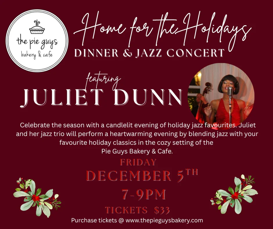 Celebrate the season with a candlelit evening of holiday jazz favourites. Juliet and her jazz trio will perform a heartwarming evening by blending jazz with your favourite holiday classics in the cozy setting of The Pie Guys Bakery & Cafe